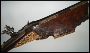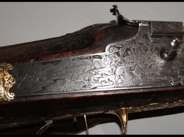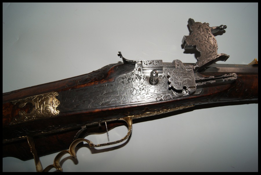 Iron chiselled lockplate with hunting scene, animals and woman with child feeding a bird. Chiselled gilt brass side plate. Barrel bearing a gilt signature and foliate scrolls. Choosen walnut mount, chiselled gilt brass furnitures.