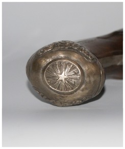 bride de pontet poinçonnée, calotte ciselée d'une étoile à cinq branches et rayons, calotte à longues oreilles ciselée de motifs rocailles sur fond amati, une oreille poinçonnée, monture de noyer