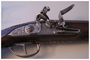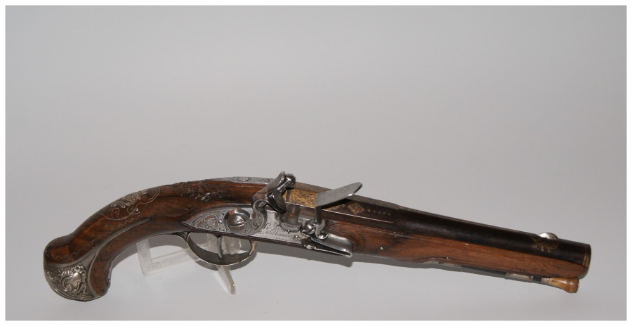 Chiselled and gilded lockplate, faceted barrel bleued and gilt chiselled with foral pattens, stamped silver side plate with rococco patterns, silver guard and also chiselled, silver buttcap chiselled with a star, sculpted walnut butt with silver filigree, silver escutcheon bearing a monogram.