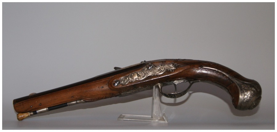 motifs floraux, mire en argent ceinte d'une palme dorée, contre platine en argent découpé poinçonné, décorée de motifs rocailles, pontet en argent profilé à l'avant en balustre et ciselé en harmonie,